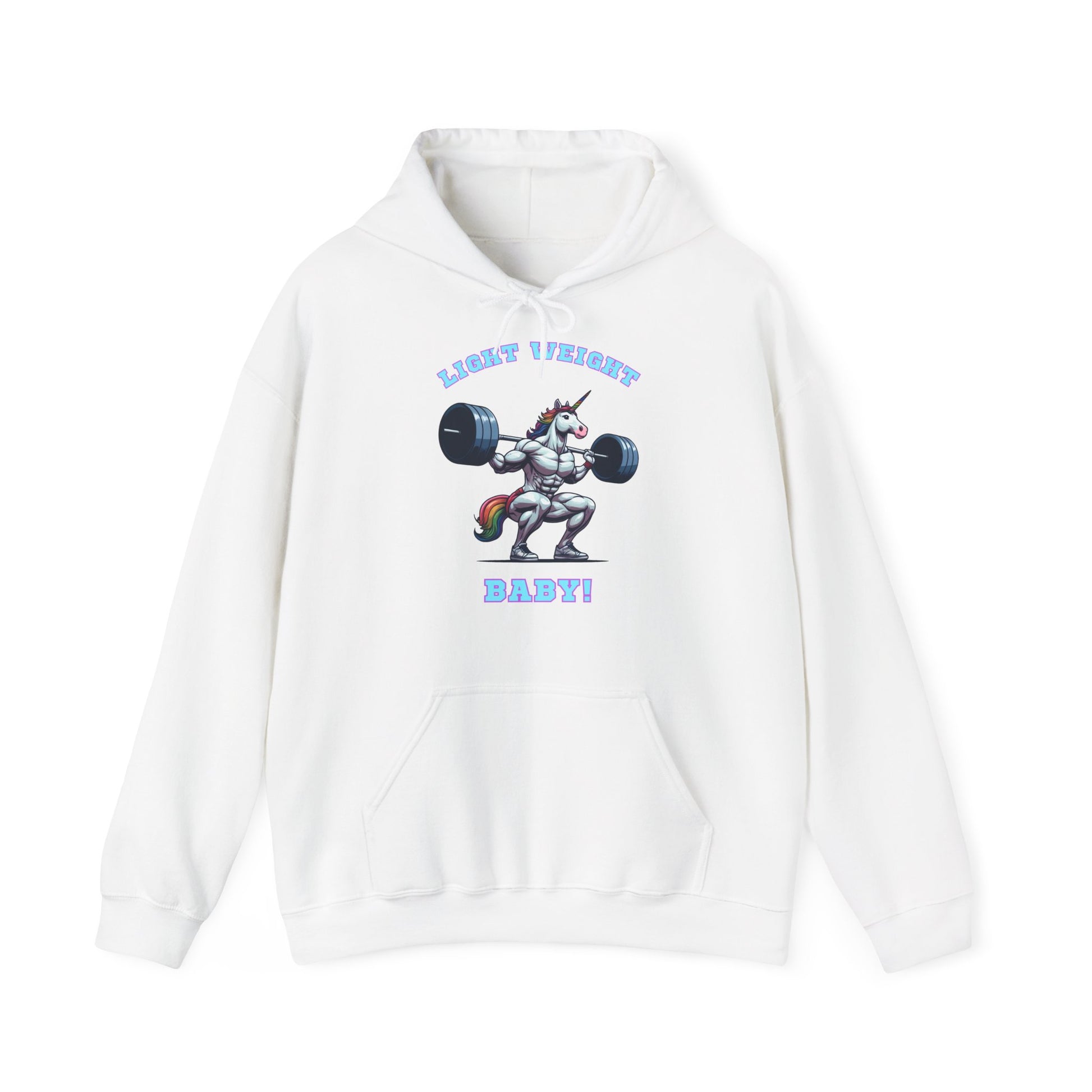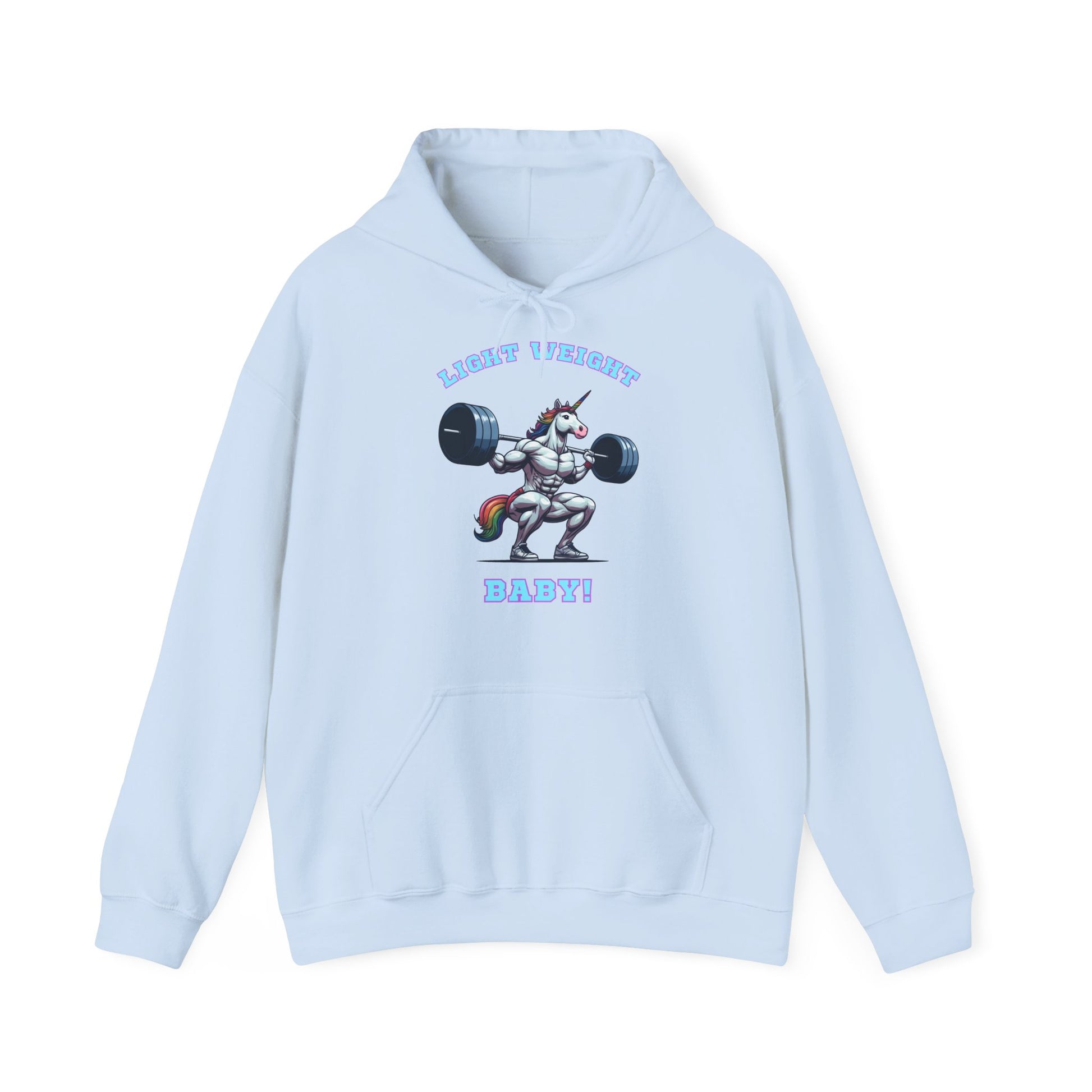Le design met en scène une licorne aux muscles impressionnants, qui soulève des poids avec détermination. La crinière et la queue colorées ajoutent un contraste vibrant, tandis que la phrase "LIGHT WEIGHT BABY !" encadre la scène, apportant une touche ludique mais motivante. Cette combinaison d'éléments crée un sweat à capuche visuellement attrayant qui se démarque. 🍀