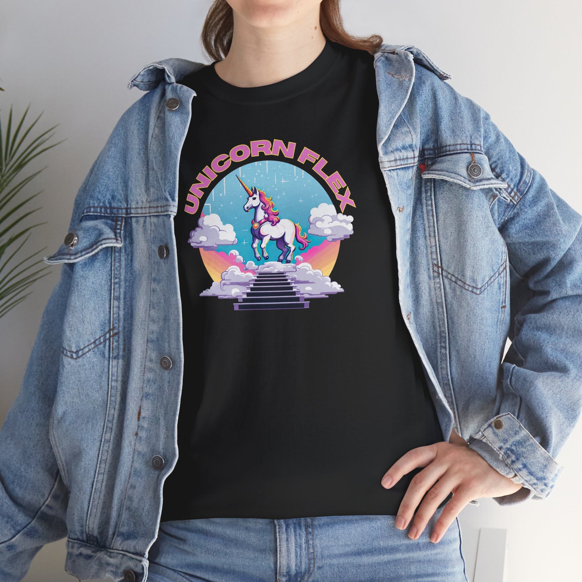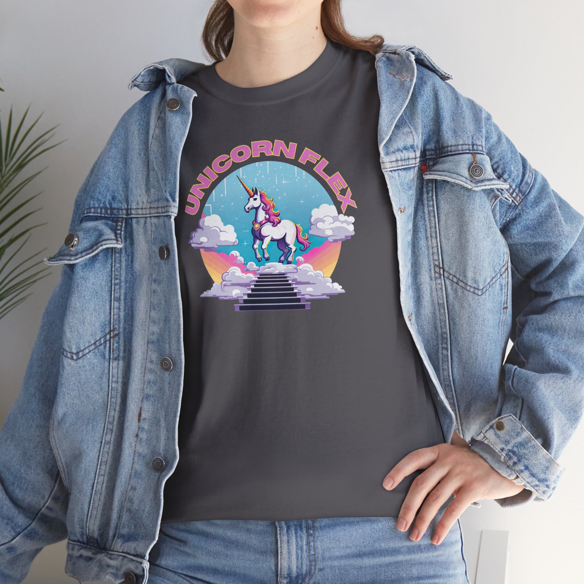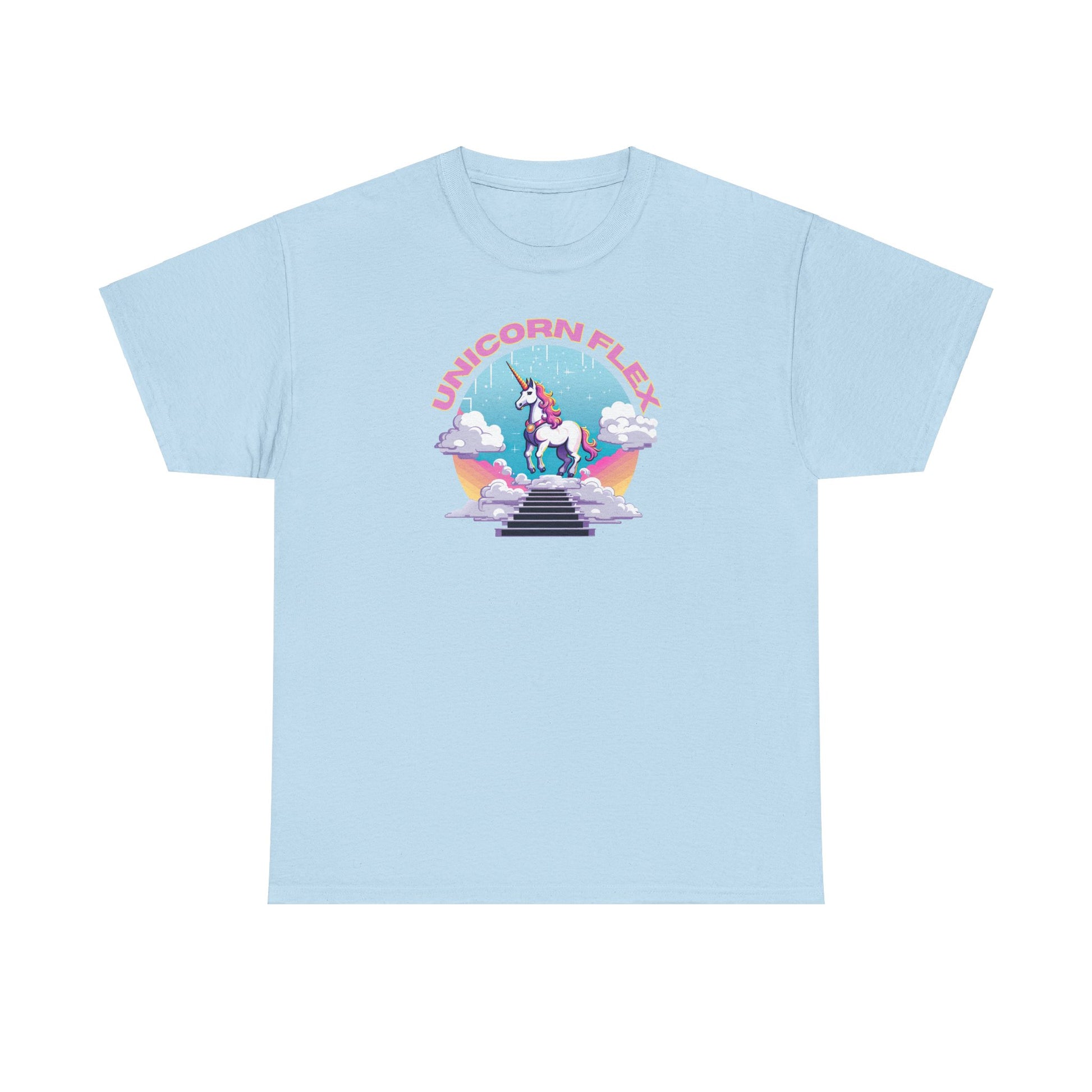 L'ornement de ce t-shirt est la licorne, une figure de pure grâce et d'esprit audacieux. Son pelage, aussi blanc que les nuages sur lesquels elle se tient, tient une crinière qui éclate avec un spectre de couleurs vibrantes, symbolisant ton chemin vibrant à travers la vie. La corne d'or ? Plus qu'un ornement, c'est un symbole lumineux de tes aspirations réalisées. Et ce médaillon - considère-le comme ta récompense pour avoir maîtrisé l'art de vivre avec enthousiasme. Et le "UNICORN FLEX" qui y est inscrit ? Ce n'est pas seulement une phrase ; c'est ton hymne personnel à l'autonomisation. 🔥