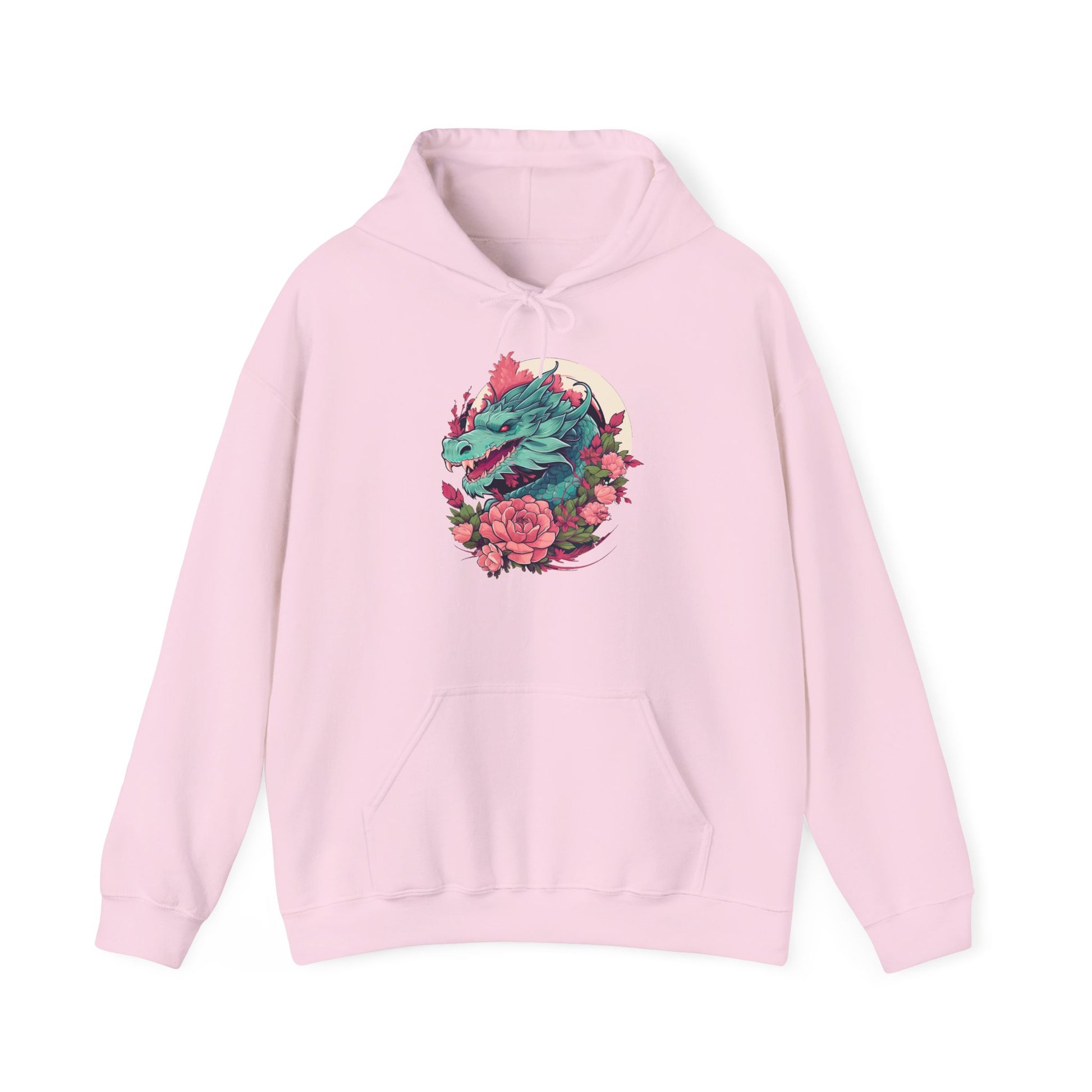 At the center of our hoodie's design lies a majestic dragon, depicted in vibrant greens with red eyes that sparkle with intensity. This mythical beast is surrounded by a cascade of cherry blossoms, presenting a visual story that speaks to the balance between strength and serenity. 🐲