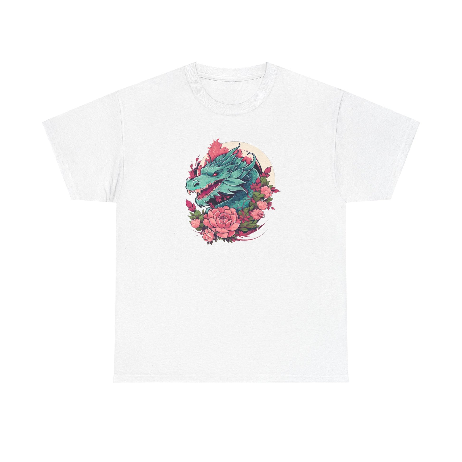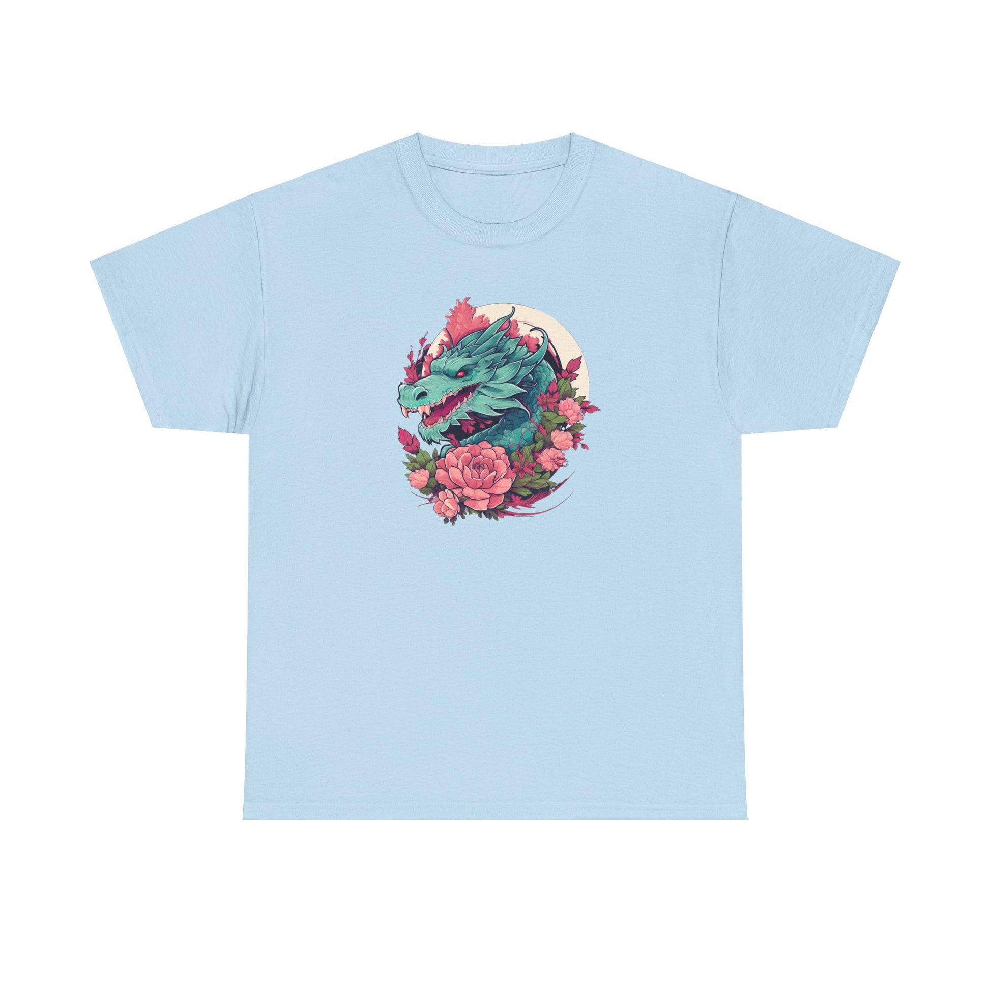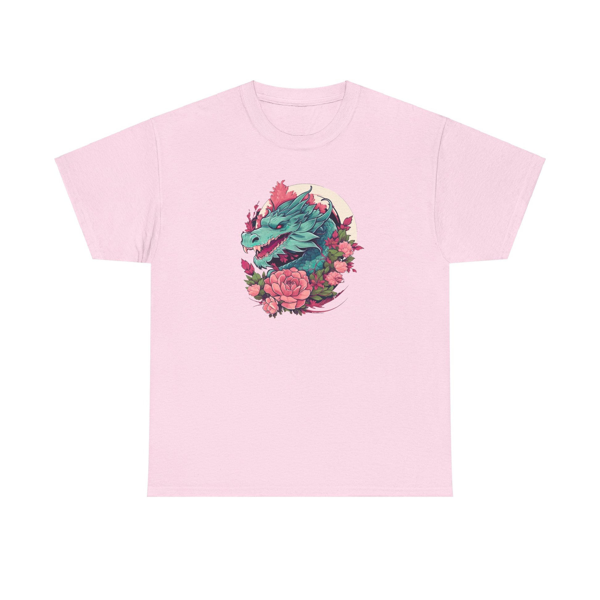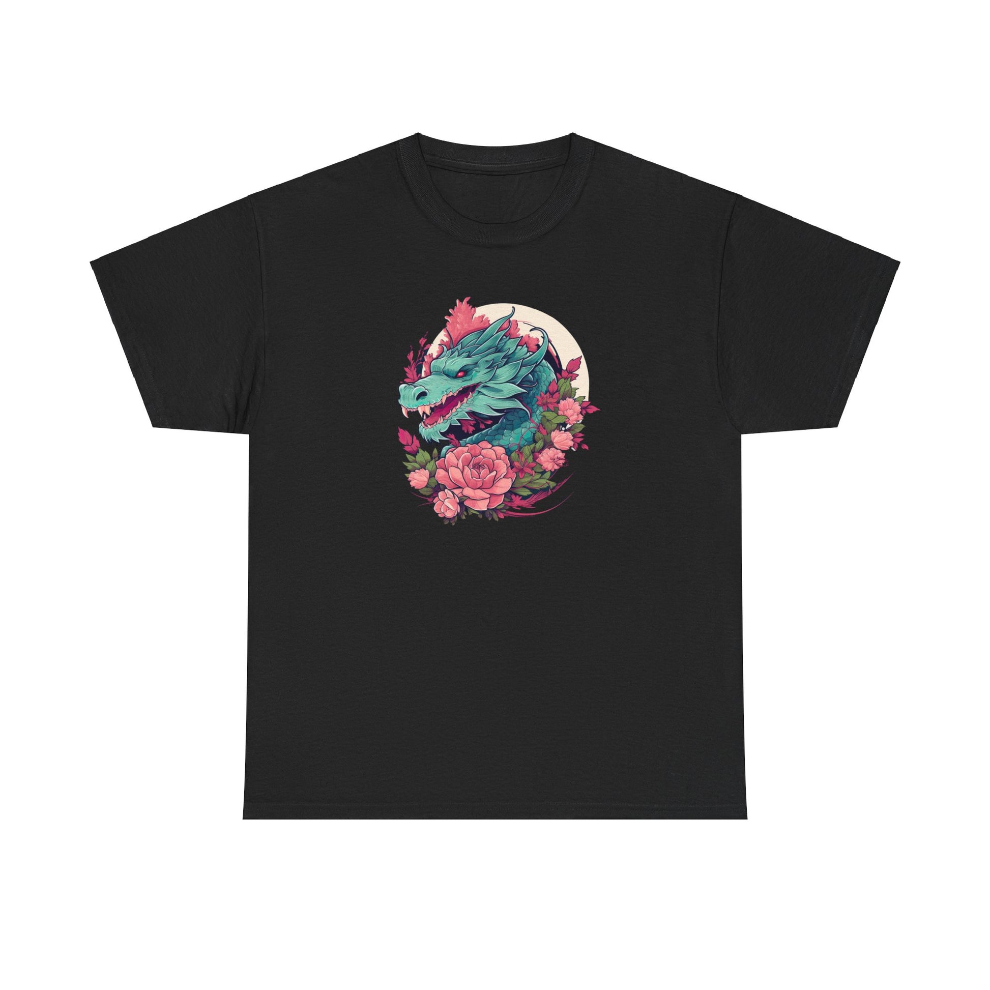 At the heart of the design, a striking green dragon head with piercing red eyes commands attention, ensconced in a circle of soft pink florals. The dragon, traditionally a symbol of power and wisdom, is rendered with a contemporary edge, making this T-Shirt as suitable for a casual meetup as it is for a night on the town. 🌌